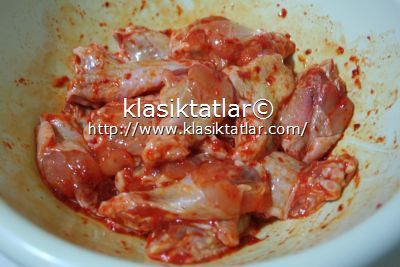 Bir kap içine kanat konulacak. Üzerine tatlı biber salçası tuz ve ayçiçek yağı ilave edilecek. Ardından malzemeler elle bir güzel karıştırılacak.