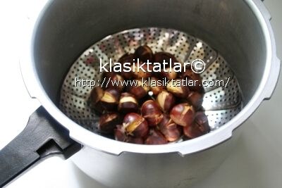 Bu tarifim, bir gün öncesi ihtiyaçtan dolayı ortaya çıkan icadlarımdan sonuncusu; kestane sevenlere armağanım olsun. Çünkü; internette böylesi bir tarif yok. Kestane haşlama ile ilgili bilinen her yönem, herkesi memnun etmiyor. Ayrıca, su içinde haşlanan kestanenin yemesi dert olduğu gibi; kestane kabuğunun çıkmaması da sorun oluyor. Bu tarif, piyasada satılan bütün kestanelerle denenmiştir, en son deneyen kişi siz olacaksınız. Kestanelerin en irileri, bu tarifle düdüklü tencerede 15 dakikada pişer. Küçük ve orta boy kestaneler ise; 5 ila 10 dakika arasında pişer. Kestanenin kıvamını ayarlamak, dişinizin keyfine kalmış. Bir avuç kestaneyi koyun buhar spetine pişirin, gönlünüzce. Ardından, kestanenin pişme süresini siz belirleyin.