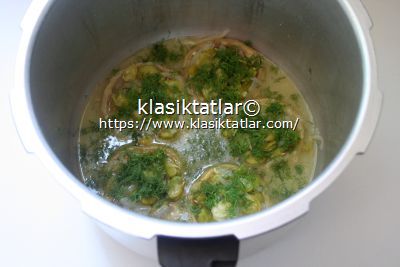 Düdüklü tencereye enginarlar dizilecek. Üzerine hazırlanan sos ilave edilecek. Ocak ısısı yükseltilecek. Malzemeler kaynamaya başlayınca düdüklünün kapağı kapatılacak ve ocak en düşük ısıya ayarlanacak. Düdüklüden buhar çıkmaya başlayınca (düdüklünün markasına göre) mandalı veya ventili indirlecek, ya da ağırlığı takılacak. Peşinden ilk düdük veya fışlama sesinden sonra saate bakılacak not edilecek. Tam 20 dakika bitiminde düdüklü ocaktan alınacak. Kapak açılacak ve enginarların içine iç bakla paylaştırılacak, limon sıkılacak ve zeytinyağı gezdirilecek. Ardından düdüklü kapatılacak ve orta ısıdan başlayıp en düşük ısıya kadar işlem tekrar başlatılacak. İlk düdük sesinden sonra ocak en düşük ısıya ayarlanacak ve saate bakılacak. Tam 10 dakika bitiminde yemek ocaktan alınacak ve üzerine dereotu serpilecek. Sonrası malum.