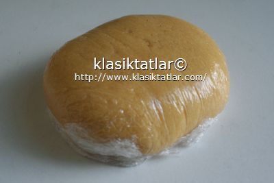 hamur yoğurulmuş streçe sarılmış 45 dakika beklemiş