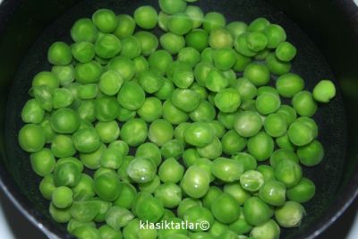 1 su bardağı iç bezelye, 1.5 su bardağı su ve 1 çay kaşığı tuz ile 20 dakika süre ile haşlanacak ve süzülecek. Çıkan haşlama suyu kullanılmayacak. Biz dondurulmuş iç bezelye kullandık.
