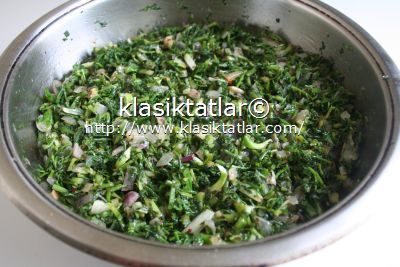 Tavaya 8 yemek kaşığı zeytinyağı konulacak ve ısıtılacak. Üzerine doğranmış kazayağı otu konulacak, karıştırılacak ve normal (orta ateşte) ısıda 5 dakika kavrulacak. Süre bitiminde karabiber, pul biber, tuz, lor peyniri ilave edilecek ve iç harç karıştırırlacak.