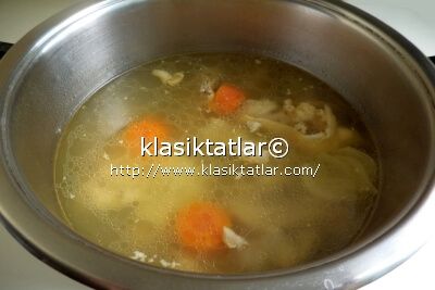 Tencereye ön haşlanmış tavuk kemikleri, soğan, havuç, kereviz, defne yaprağı, 1 tatlı kaşığı tepelice doldurulmuş tuz ve 2 litre musluk suyu konulacak. Ardından ocak ısısı yükseltilecek. Tencere kaynamaya başladıktan sonra kapatılacak. Ocak ısısı en düşük ısı konumuna getirilecek. Tam 3 saat bitiminde ocaktan alınacak ve tel süzgeçte süzülecek. Sonrası malum.